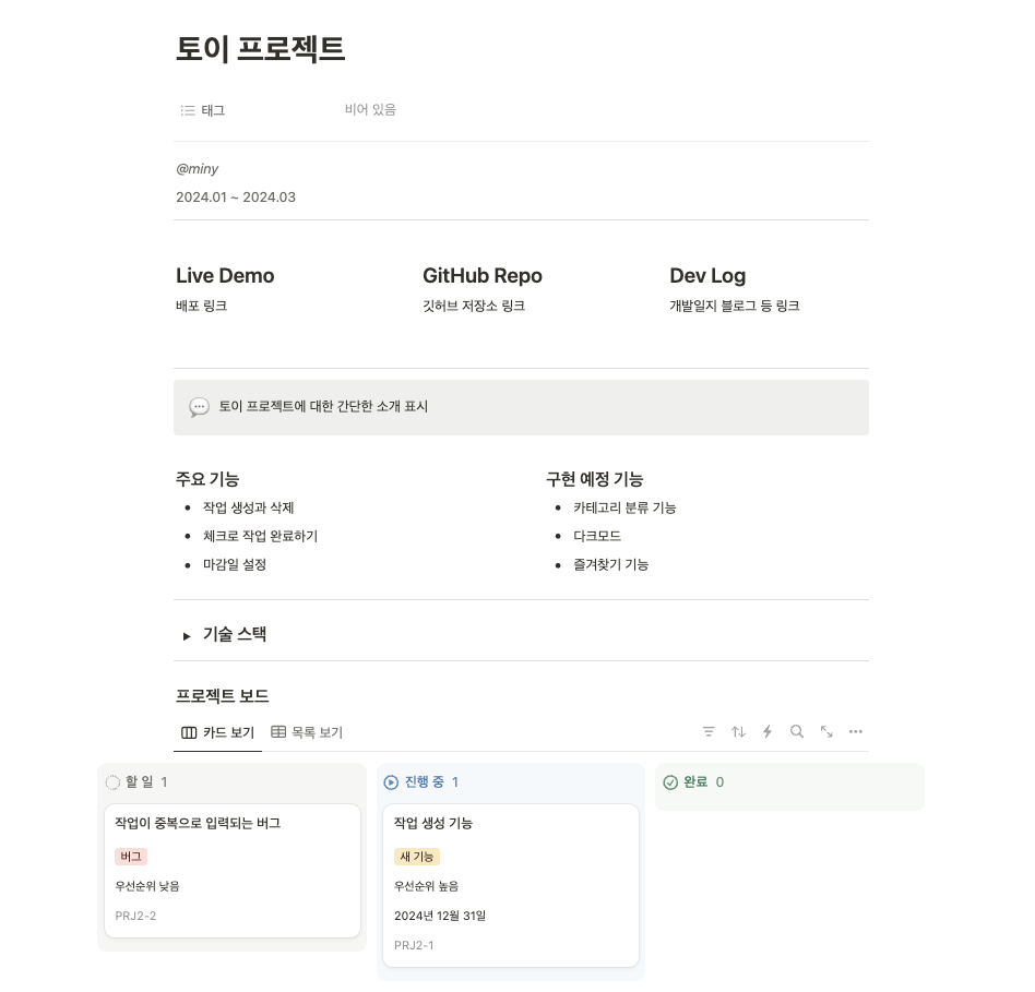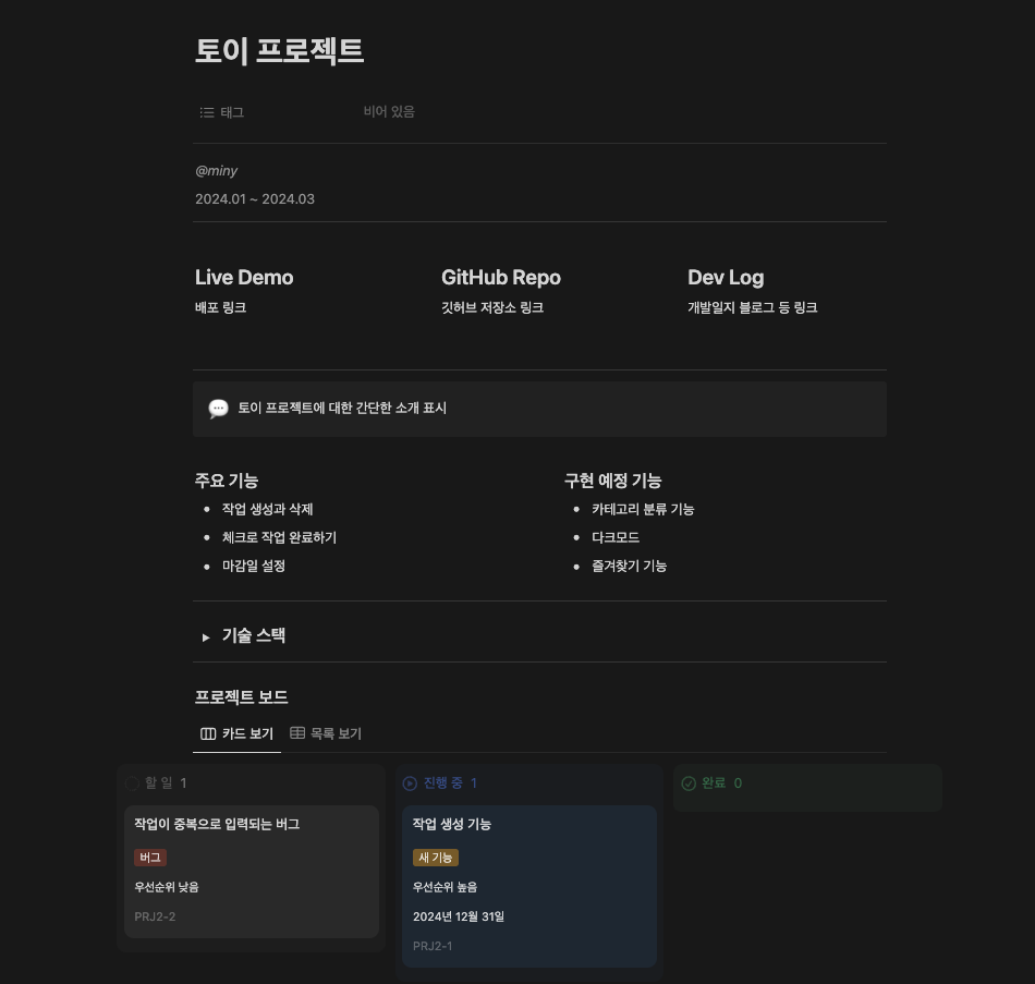 또한 라이브 데모와 깃허브 저장소, 개발일지를 포함시킬 수 있고, 프로젝트 개요와 주요 기능, 구현 예정 기능을 추가해서 해당 토이 프로젝트에 대한 문서로 활용할 수도 있어요 :)