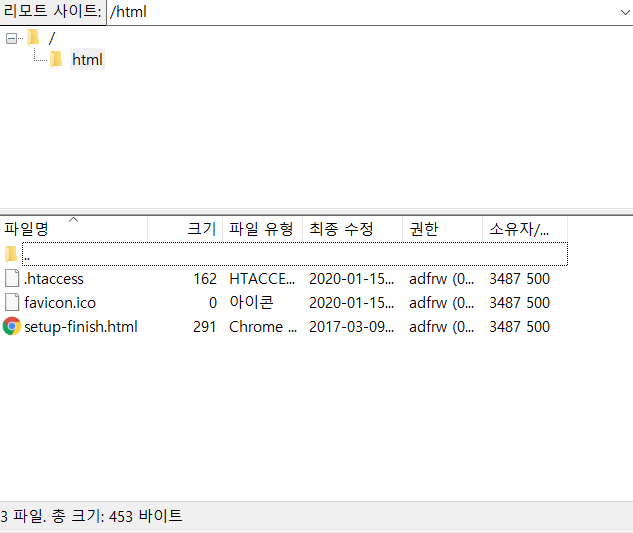 기본 파일인 setup-finish.html 이다. 웹 FTP로 들어가기 위해서는 ftp://아이디.dothome.co.kr/ 를 입력하면 되지만 파일 관리를 할 수 있는 것 같진 않다. 닷홈 서비스 메뉴얼을 따라 FileZilla를 이용해보도록 하자.