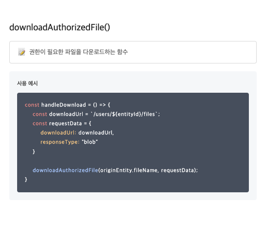 권한이 필요한 관리자 페이지에서의 다운로드가 기존에 써왔던 방식으로는 작동하지 않아서 해당 함수 로직을 만들어보게 됐고 네이밍이 authorizedFile이 되었다. 기존 방식은 함수 외부에서 다운로드 할 객체를 미리 만들어두고 다운로드 로직을 탔었는데, 지금 방식은 직접 서버에 다운로드 객체를 요청한다.