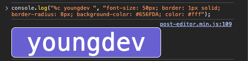 console.log("%c youngdev ", "font-size: 50px; border: 1px solid; border-radius: 8px; background-color: #656FDA; color: #fff");