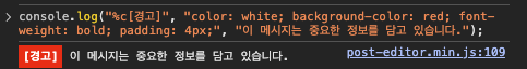console.log("%c[경고]", "color: white; background-color: red; font-weight: bold; padding: 4px;", "이 메시지는 중요한 정보를 담고 있습니다.");