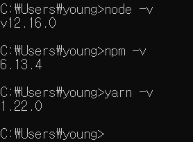 명령프롬프트(cmd)에서 node -v npm -v yarn -v를 입력한다.