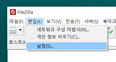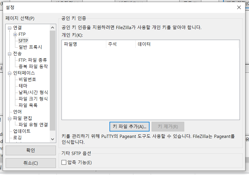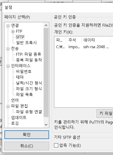 먼저 파일질라를 실행한 후에 편집, 설정에 들어가서 키 인증을 받아줘야 한다.