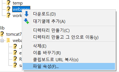 먼저 webapps 폴더에 우클릭 한 다음 파일 속성을 눌러준다.
