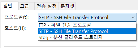 프로토콜은 SFTP로 선택한다. 차례로 호스트, 포트를 입력해준다.