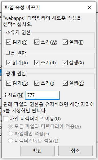 참고로 777은 모든 권한(읽기, 쓰기, 실행)을 부여 하는 것이다.