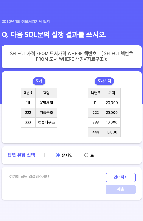 테스트용 문제를 두 가지만 넣어서 다양한 문제에 대한 화면 처리는 작업하지 않은 상태이다.