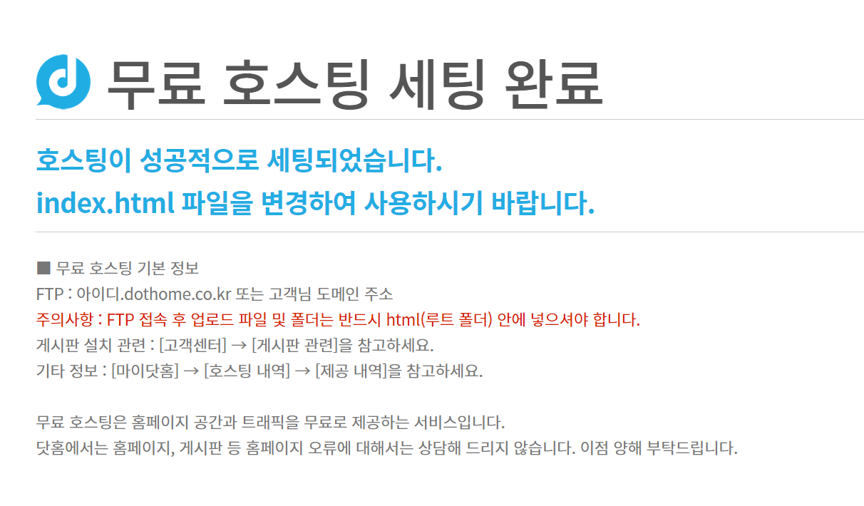 이메일 인증을 완료하고 나면 아이디.dothome.co.kr/ 으로 서비스를 제공받는다.